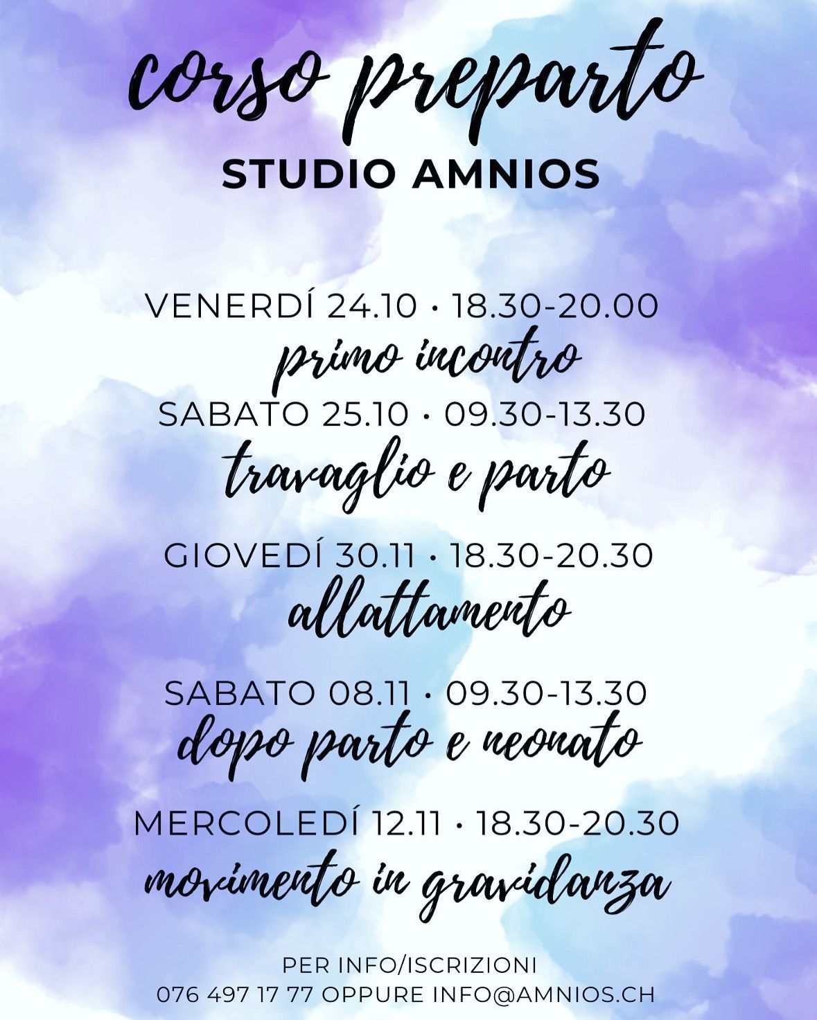 Ogni mese corsi di accompagnamento alla nascita, movimento in gravidanza, rieducazione del pavimento pelvico, massaggio al neonato e la nuova avventura dello svezzamento.
